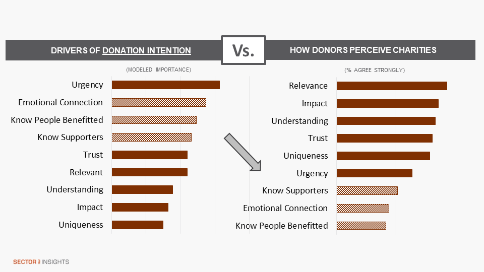 This research explored a wide range of drivers of charitable giving. Among the characteristics associated with driving donation behaviour, one of the key insights was the significant importance of emotional and personal connections felt by donors. These characteristics are more important than the rational elements we see so often in charity solicitations and appeals; the ones about the relevance of the cause, trust, operating efficiency and mission impact. The interesting disconnect was that most non-profits are under-delivering on these key emotional drivers of fundraising success, often spending valuable resources reassuring donors on the less important, rational messages.