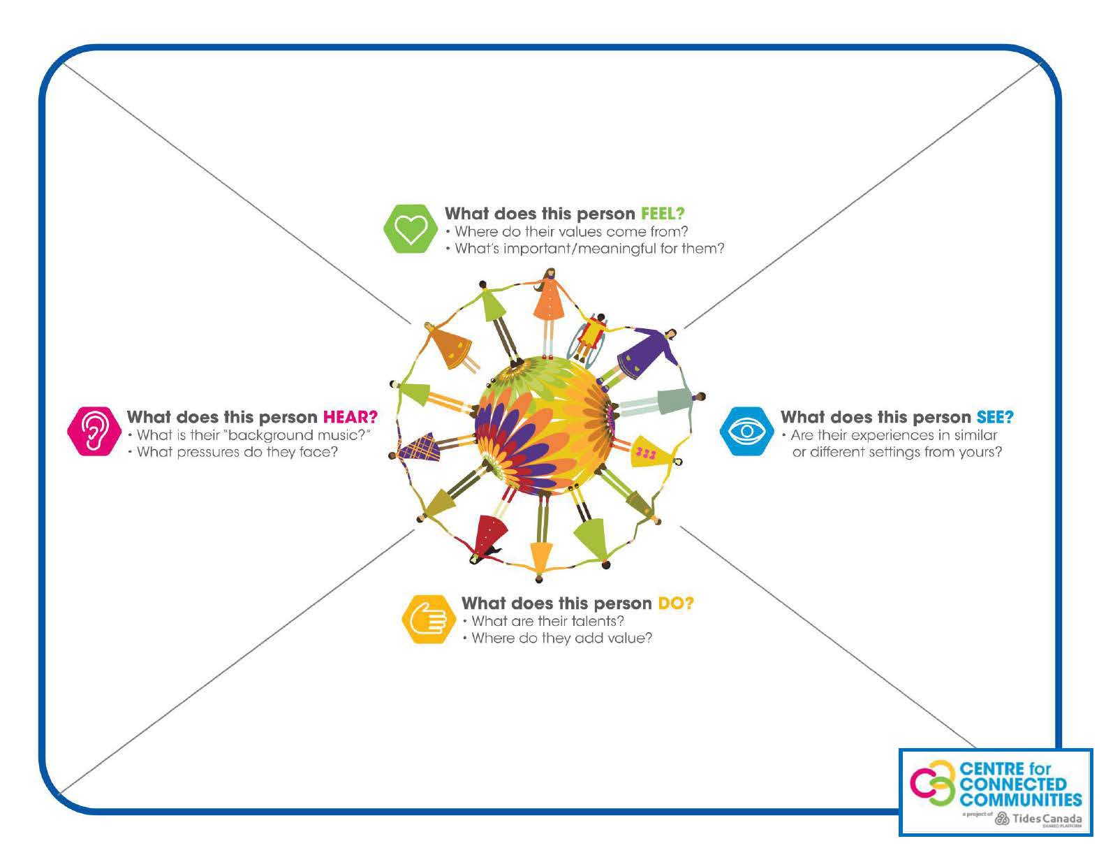 Empathy mapping also helps in program evaluation design by encouraging staff to think through accessibility and engagement when it comes to data collection. The Connected Communities Approach is a fabulous example of community building practices that are founded on empathy, trust and building authentic and meaningful connection to people. For more on how to conduct an empathy mapping exercise, I would recommend visiting this resource.
