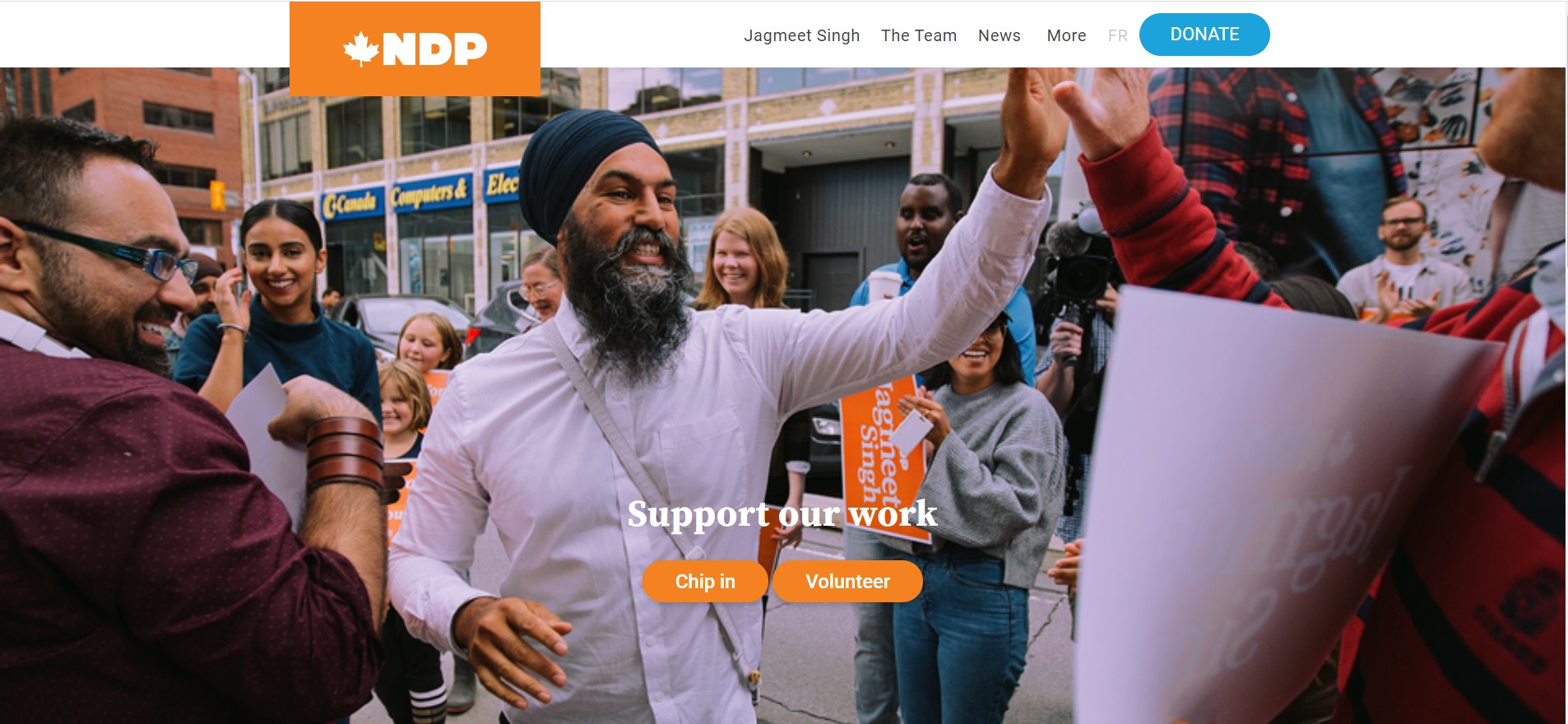 From a fundraising perspective, this may be the strongest landing page. It has the single, highlighted Donate button at the upper navigation bar. However, it also has a second opportunity to "Chip in" further down on the page. By having two places that ask for a donation, the NDP is optimizing their chances of receiving a gift.