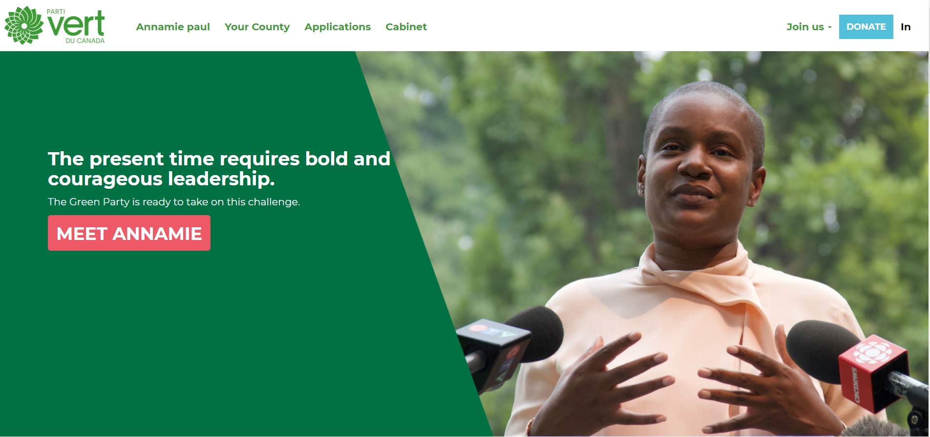 From a fundraising perspective, the single, solid Donate button jumps out from the upper navigation bar. It is clear. There is a button lower on the page that invites you to meet Green leader Annamie but your eye will see the donate button first. There is a second opportunity to donate at the bottom of the page which gives viewers another place to make a gift.