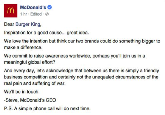 Consider the Burger King launch of a surprise McWhopper campaign – submitting a public, online proposal to McDonald’s asking them to bury their “burger war” for one day in support of charity. Unfortunately, McDonald’s rejected their olive branch with the following on Facebook: